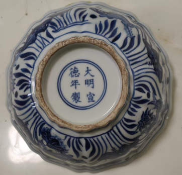 大明宣德年制青花鱼藻纹十棱菱口大碗